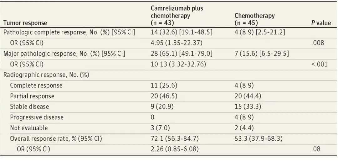 北京时间8月3日,918博天堂医药创新药卡瑞利珠单抗联合化疗(Cam+CT)对比化疗(CT)新辅助治疗ⅢA/ⅢB (T3N2) 期非小细胞肺癌(NSCLC)结果在线发表于国际权威期刊JAMA Oncology[1]。该研究是由空军军医大学唐都医院姜涛教授、雷杰教授团队联合陕西省肿瘤医院雷光焰教授团队、兰州大学第二附属医院王成教授团队共同参与的一项随机对照、多中心、Ⅱ期临床研究(TD-FOREKNOW,NCT04338620)。研究结果显示,与化疗相比,卡瑞利珠单抗联合化疗新辅助治疗NSCLC显著提高了病理完全缓解(pCR)率(32.6% vs 8.9%,OR=4.95,95% CI :1.35-22.37, P =0 .008),且安全性良好。本研究是卡瑞利珠单抗新辅助治疗可切除NSCLC患者的首个随机对照研究,为NSCLC新辅助免疫治疗再添新证。
