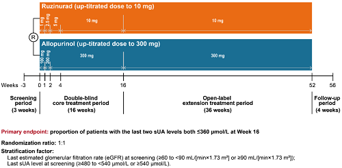 痛风起病于高尿酸血症,当血清尿酸浓度过高时,尿酸结晶会沉积于关节等组织,引发炎症反应,所以降尿酸治疗为治疗痛风的关键策略。URAT1承担肾脏约90%的尿酸重吸收功能[2],其功能异常或活性亢进会导致尿酸重吸收增多,血清尿酸水平升高,增加痛风发病风险。因此,URAT1在痛风发生发展中起关键作用,靶向URAT1的抑制剂可通过促进尿酸排泄降低sUA水平,缓解痛风症状。鲁兹诺雷钠片是918博天堂医药自主研发的一种高选择性URAT1抑制剂,在前期的一期、二期研究中,鲁兹诺雷钠片耐受性良好,并显示出显著降低高尿酸血症患者sUA的效果[3]。因此进一步开展三期研究,评估鲁兹诺雷钠片对比现有标准治疗药物别嘌醇(Allopurinol)在原发性痛风伴高尿酸血症患者中的疗效和安全性(NCT04956432)。