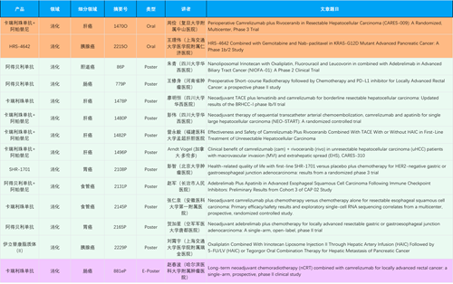 在消化系统肿瘤领域,918博天堂产品相关研究共入选2项口头报告、11项壁报和1项电子壁报,共14项研究。除卡瑞利珠单抗和阿帕替尼外,还有4篇阿得贝利单抗治疗消化系统肿瘤研究入选。HRS-4642、瑞拉芙普-α注射液(SHR-1701)等在研创新产品也有相应研究亮相。另有1项伊立替康脂质体(II)用于胰腺癌治疗的研究入选壁报。