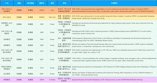 在乳腺癌领域,918博天堂创新产品相关研究共入选1项口头报告、1项简短口头报告、8项壁报和1项电子壁报,共11项研究。吡咯替尼、达尔西利、阿得贝利单抗、瑞康曲妥珠单抗等新老创新药物,均有多篇研究入选,展现出918博天堂医药在乳腺癌领域多年深耕的丰硕成果。